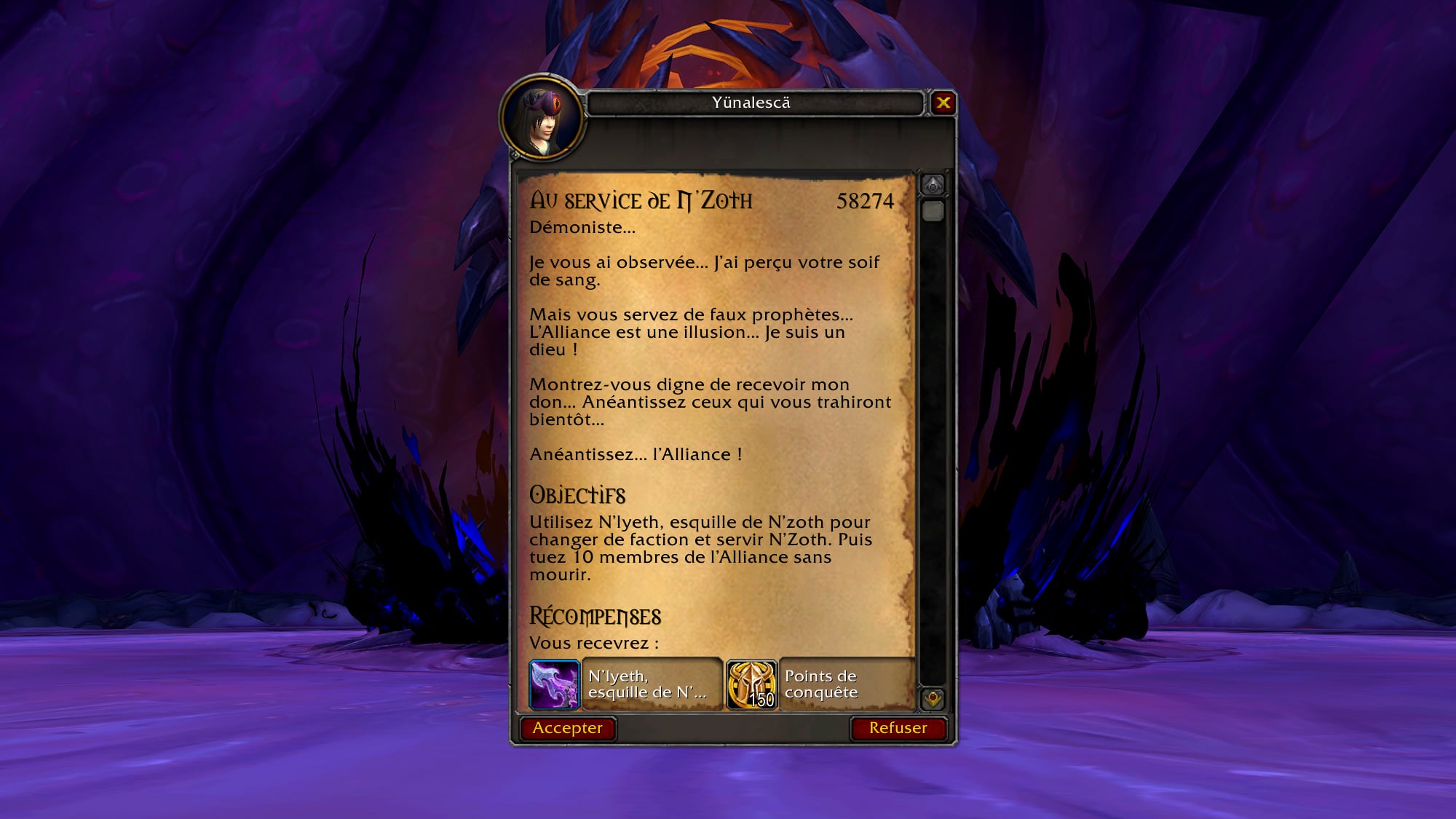 N'lyeth, esquille de N'Zoth et 150 Conquête pour tuer 10 joueurs de sa faction. - Les personnages-joueurs vaincus de sa propre faction permet de rapporter des points d'honneur par victoire honorable.