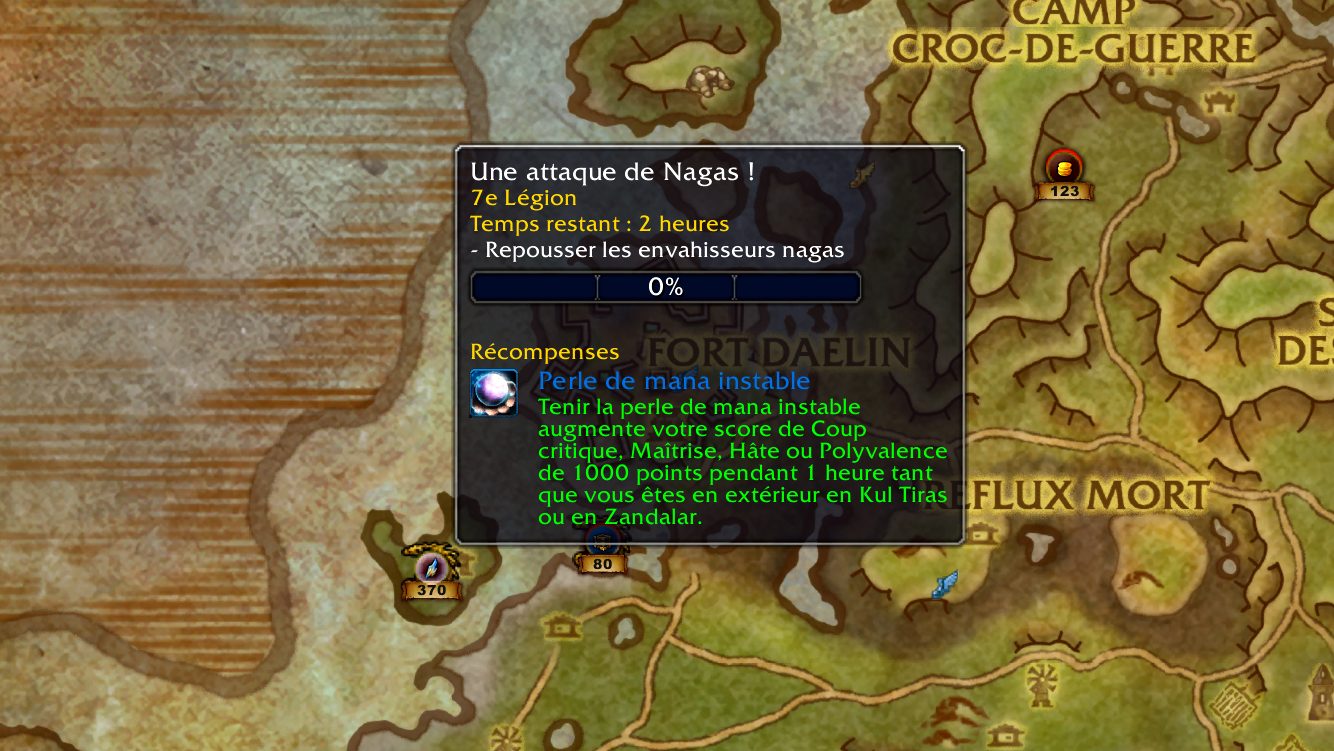 Médaillon d'Azshara sur les nagas de Kul Tiras et Zandalar lors des assauts pour lancer la quête. - Cette suite de quêtes prend 15 à 20 minutes en moyenne pour récupérer les trois artéfacts extrêmement puissants.