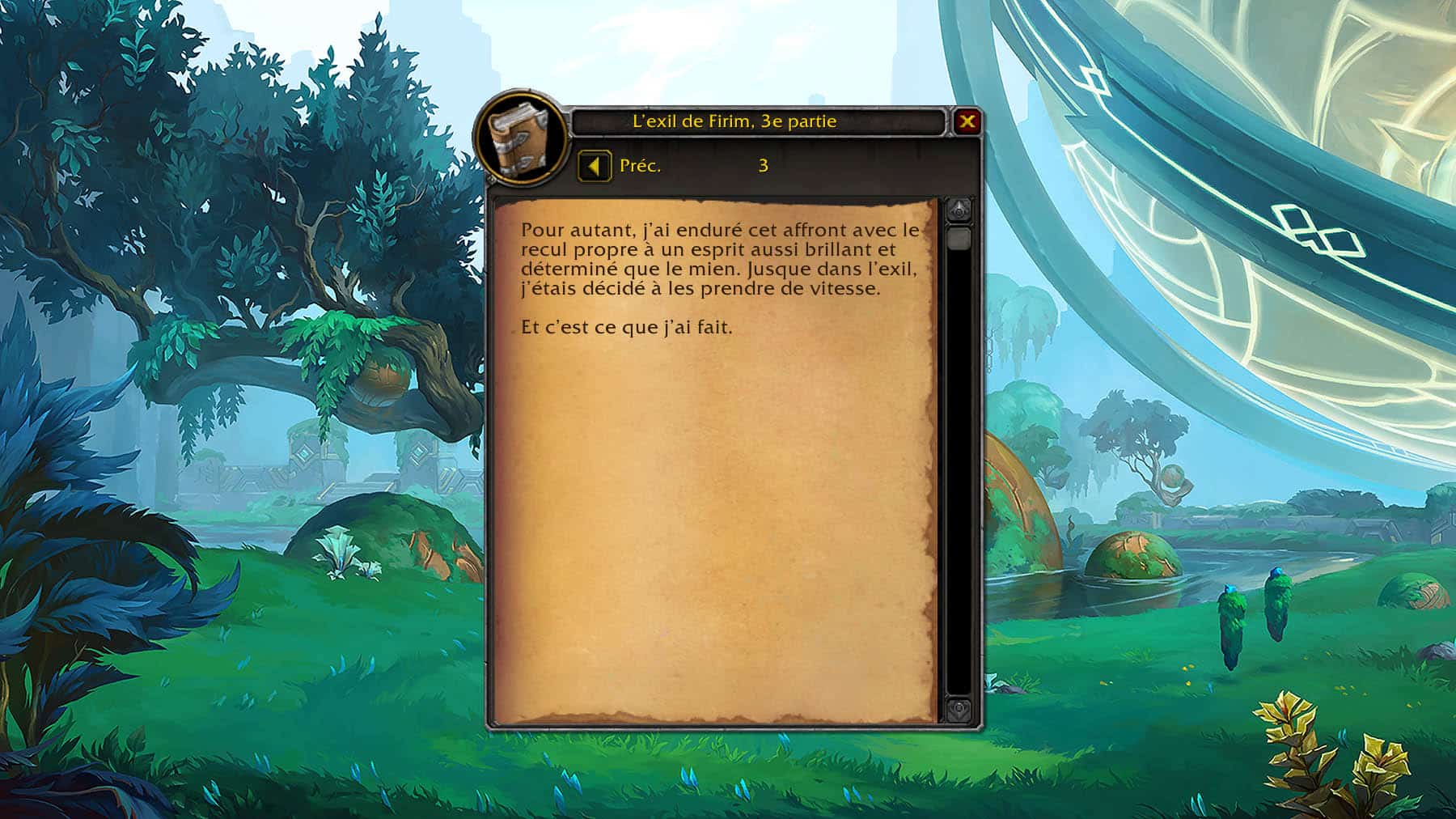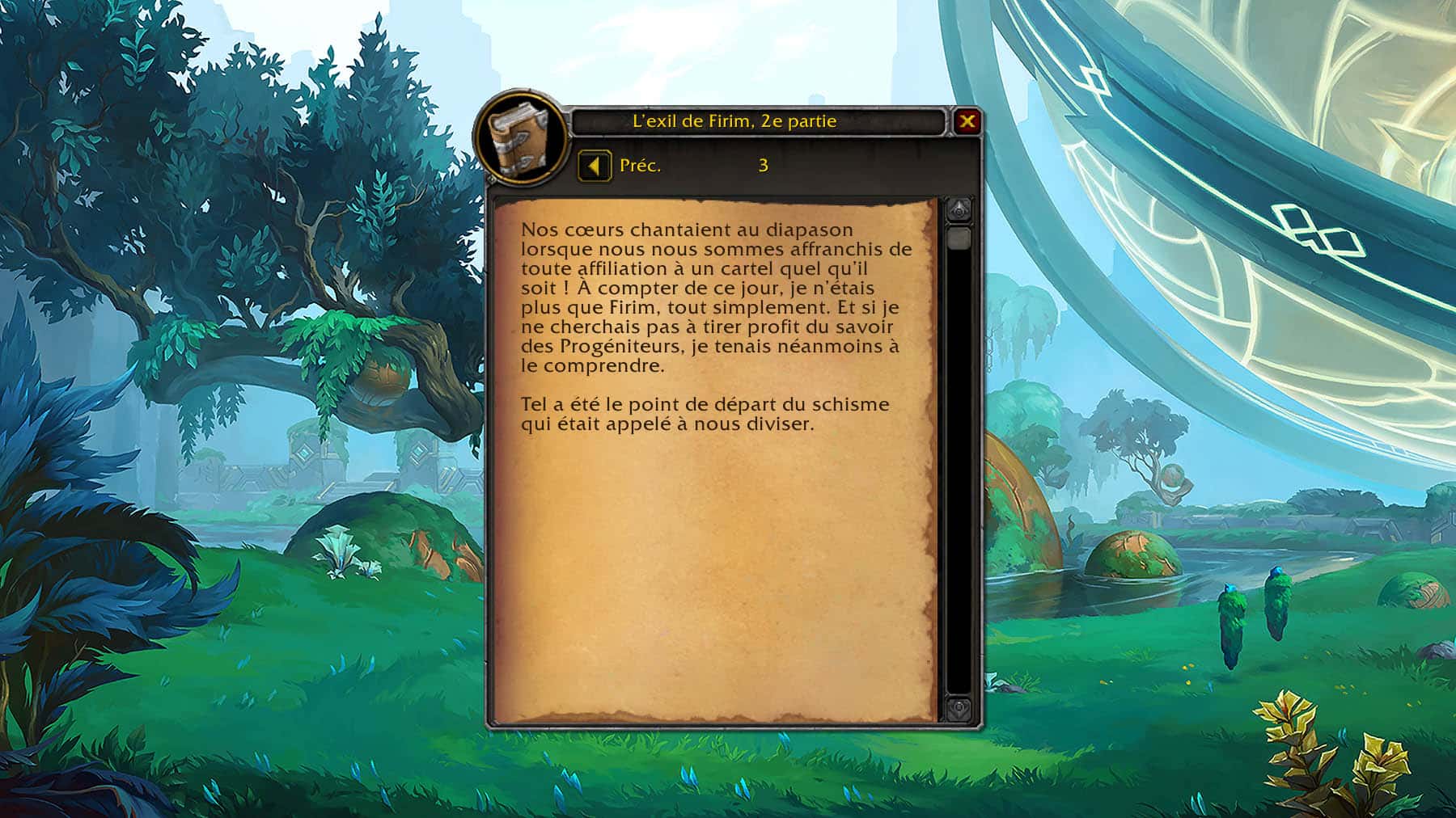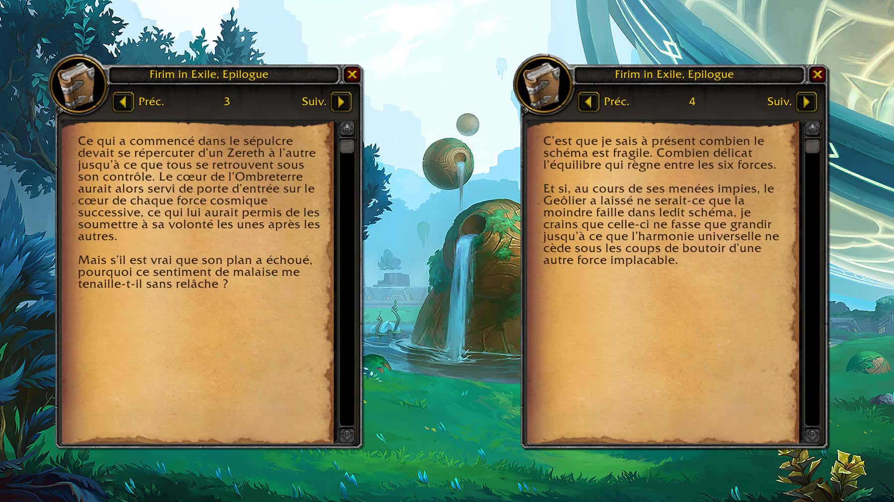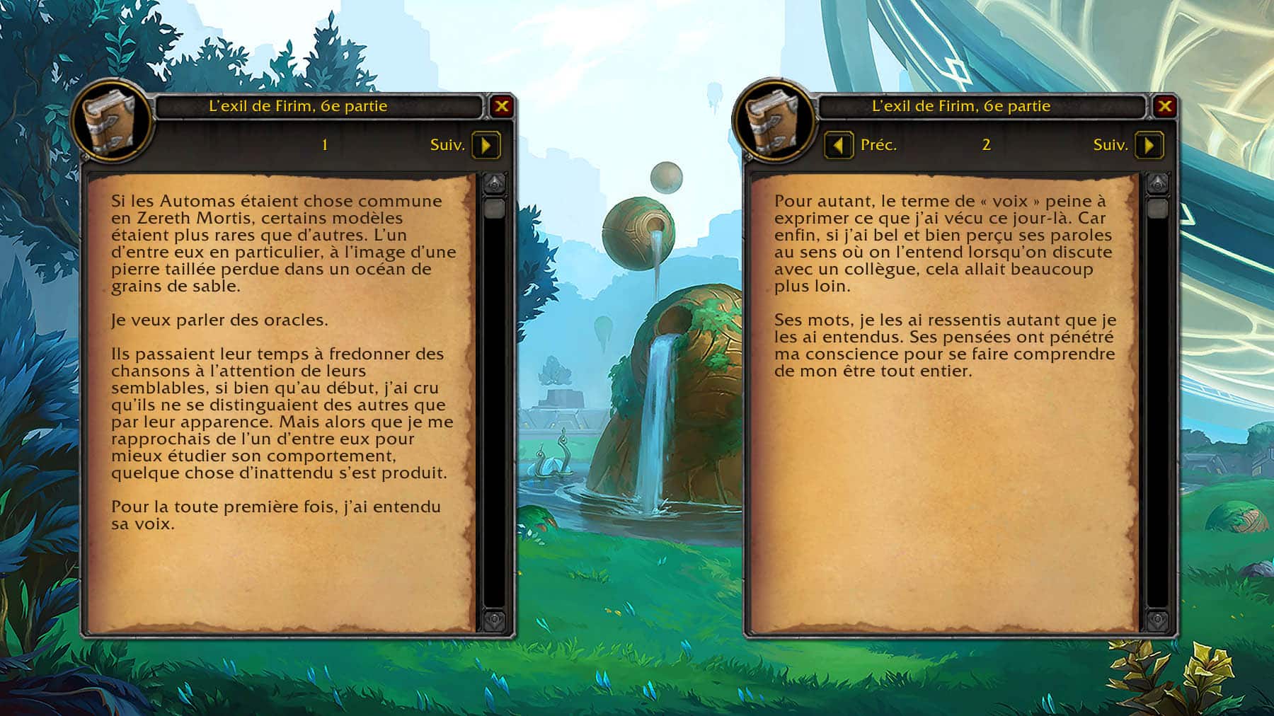 Depuis que le passage entre Oribos et Zereth Mortis a été ouvert par l'éveil de la pierre d'accès antique, les cartels de négociants se sont infiltrés pour fouler les terres sacrées des Fondateurs. Au cours d'une ancienne expédition, Firim a trouvé le chemin de ce royaume par l'alignement des fractales. Pendant ce temps, ce négociant du cartel Al a disséminé toutes ses découvertes en 8 tomes de l'exil de Firim à travers plusieurs endroits dans la région. Il est important de signaler que ces tomes sont une étape obligatoire pour débloquer la compétence de vol de Zereth Mortis sur l'ensemble du compte.