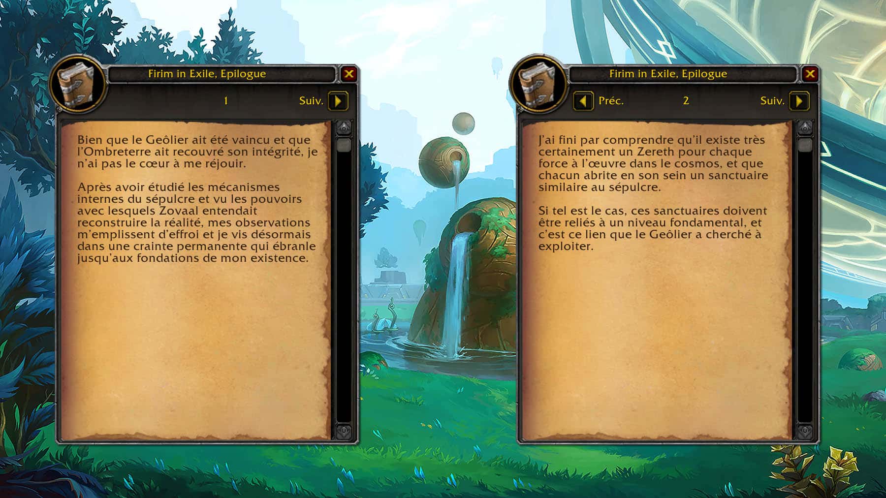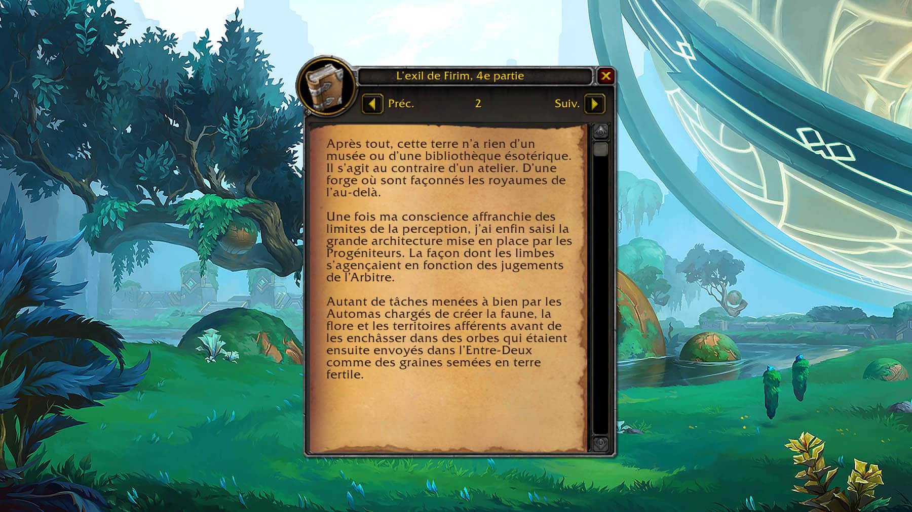 - La lecture des tomes sur l'exil de Firim est une étape obligatoire pour débloquer le vol de Zereth Mortis.