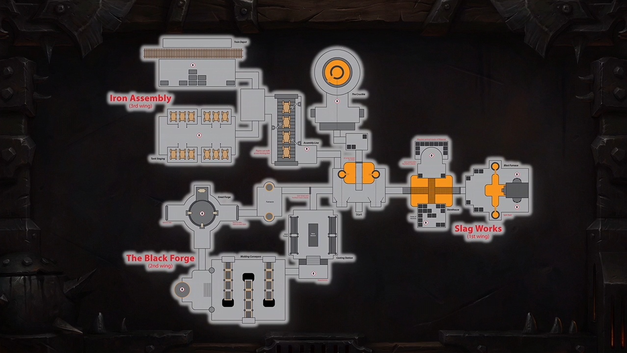 Le premier raid a été révélé car il s'agit de la Fonderie Rochenoire : ce raid est composé de 10 boss avec trois ailes (fonderie, forge et assemblage) non-linéaire (carte). Un système similaire à la Citadelle de la couronne de glace lors de Wrath of the Lich king qui permet de tuer les boss dans l'ordre que vous le souhaitez. Ce raid est le centre stratégique de la Horde de fer, un lieu primordial de l'histoire car le principe est d'empêcher les agissements de la Horde de Garrosh Hurlenfer. La principale particularité de ce raid est qu'il est possible d'avoir une vision globale du raid en regardant en haut et en bas.
