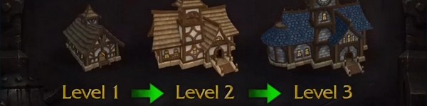 Trouver l’apparence idéale n’était que l’une des nombreuses tâches à accomplir. L’accroissement progressif de la puissance des fiefs étant un élément essentiel de cette fonctionnalité, nous voulions refléter cette évolution dans les graphismes. Concrètement, chaque bâtiment de fief doit pouvoir évoluer en versions de plus en plus épiques. Le système de construction des fiefs (qui permet de personnaliser leur agencement et de placer les bâtiments où bon vous semble) a représenté un véritable défi pour l’équipe artistique, car si le bâtiment doit être plus épique à chaque amélioration, ses fondations, elles, doivent rester inchangées. Voici quelques exemples des travaux en cours de développement ci-dessous.